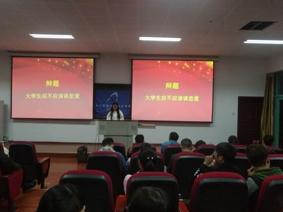 11月22日下午,由我院营销先锋协会主办的首届趣味辩论赛“大学生应不应该谈恋爱”在机投校区学术报告厅举行,院团委刘洪舟老师及一百多名社团成员参加了此次活动。
