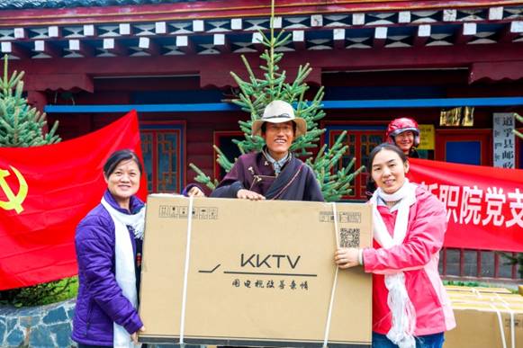 党课结束后,启动了四川华新职院党支部对口帮扶贫困户走访慰问活动。启动仪式上,经管学院党支部与学院的其他8个党支部一起,向格西村的38户贫困户捐赠了由华新学院党员教师自主捐款购买的液晶电视和冬季防寒衣物。
