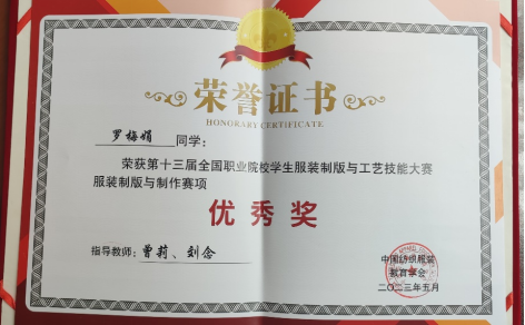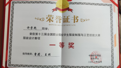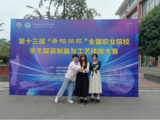 2023年5月26日至28日,成都纺织高等专科学校院举行的2023年第十三届全国职业院校服装制板与工艺技能大赛,我院学生获得"服装设计赛项”一等奖和“服装工艺赛项”优秀奖。