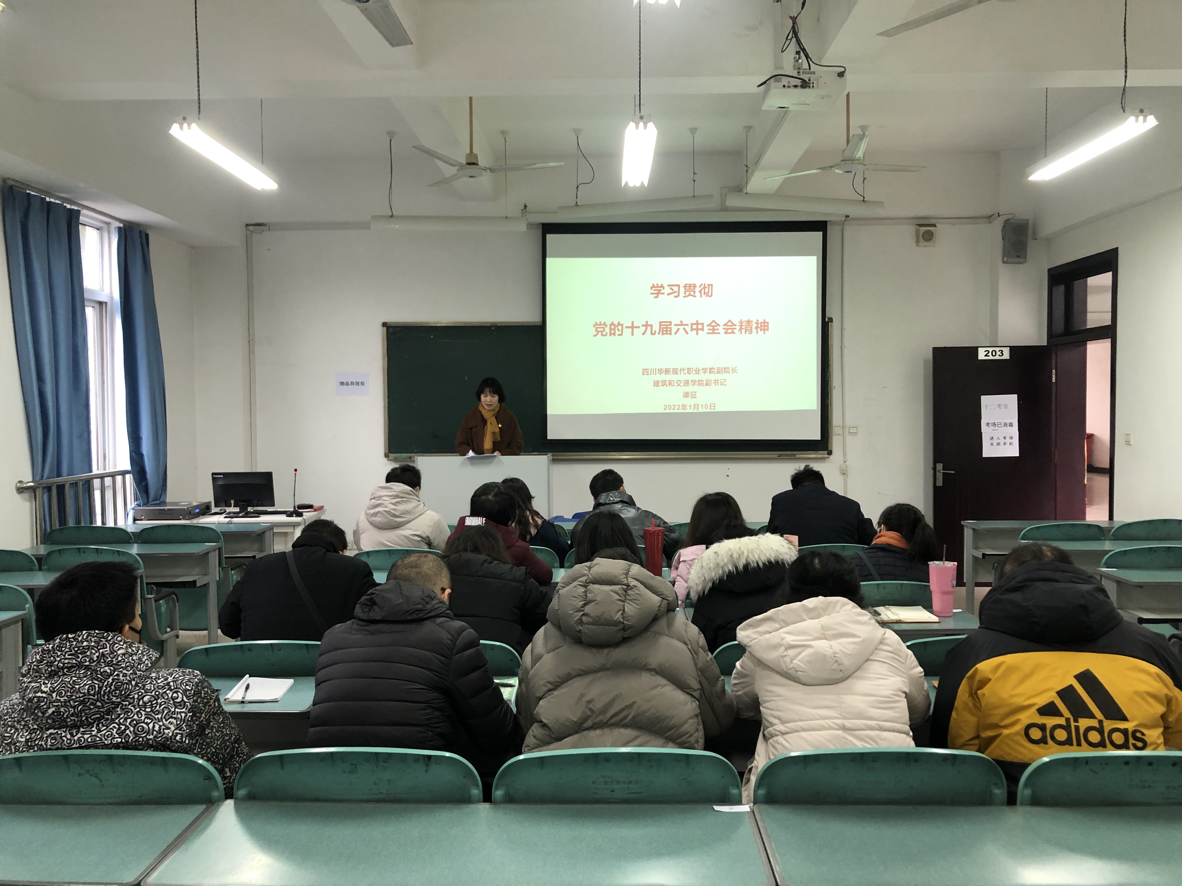 2022年1月10日上午,建筑和交通学院全体教师在博学楼203教室开展党的十九届六中全会精神专题学习。华新学院副院长谭征为建筑和交通学院教职工讲授了《坚守初心,砥砺奋进——学习贯彻党的十九届六中全会精神》的专题党课。