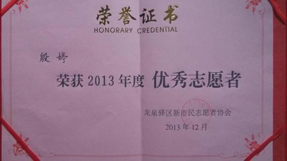 2013年12月,旅游系殷婷同学获评龙泉驿区新市民志愿者协会“2013年度优秀志愿者”称号。