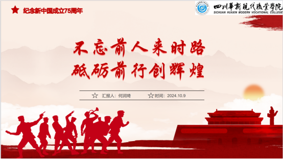金秋十月,我们迎来了新中国成立75周年的辉煌时刻,在这充满收获与希望的季节,全国上下一片欢腾,共同庆祝这一伟大的节日。华新学院校学生会于2024年10月11日下开展第9期“团史青年说”,号召青年学子踔厉奋发向未来。活动由校学生会办公网宣部郭婷婷主持,校学生会办公网宣部何润琦同学主讲,校学生会全体成员,以及团委会、新媒体、青协、艺术团、自治委、国旗队和各二级学院学生代表120余人参加。
