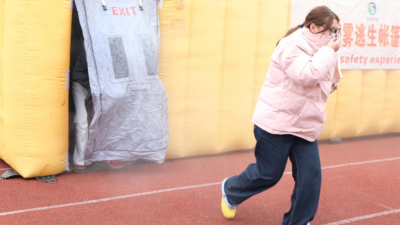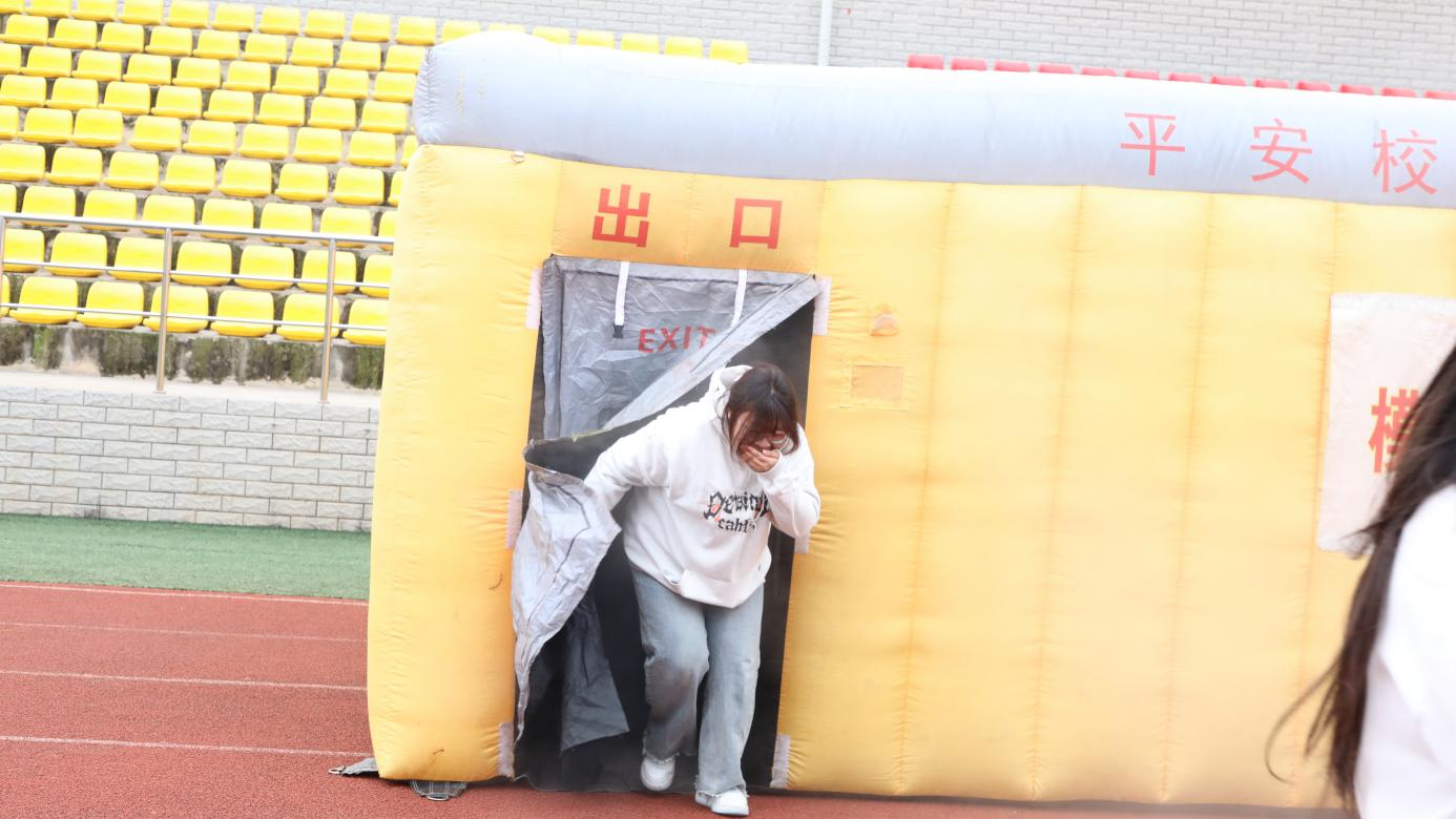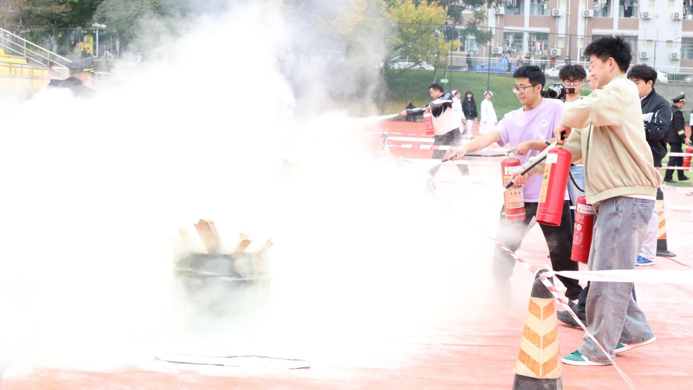 为进一步强化实操能力,演习设置专项实操体验环节。各二级学院学生代表分组参与,部分学生代表在保卫处老师的全程指导下,亲身参与灭火器实操灭火训练,从火源识别、器材检查到规范喷射,完整完成灭火操作流程;其余学生代表进入模拟逃生烟雾帐篷,在贴近真实火灾烟雾的环境中,练习疏散逃生技巧,切实提升应对复杂火情的实战能力,现场学习氛围浓厚,实操效果显著。