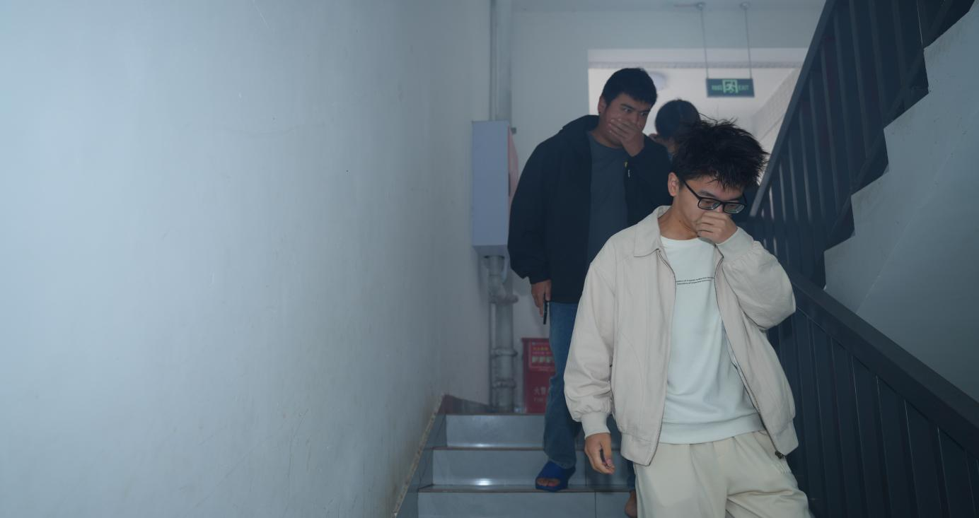 演习正式启动后,模拟“浓烟”迅速在宿舍楼楼道内弥漫,疏散撤离广播指令与引导人员的信号哨声同步响起。全体学生严格按照预设流程,迅速用湿毛巾捂住口鼻,保持弯腰低姿,在宿管人员、安保人员及教师的有序引导下,沿着指定疏散路线快速撤离“火灾现场”,并在安全集结点完成清点报到,整个疏散过程紧张有序、规范高效,充分展现了全院师生良好的应急反应能力。