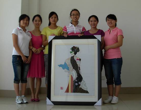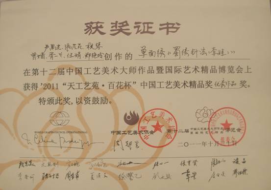 2011年10月在位于杭州和平国际会展中心举办的“2011天工艺苑、百花杯中国工艺美术精品展”中,我院应用技术系蜀绣专业学生税琴、张芃芃、曾嫱、胥一兰、任娟、郑艳玪等绣制的《蜀绣针法(李娃)》荣获优秀奖。