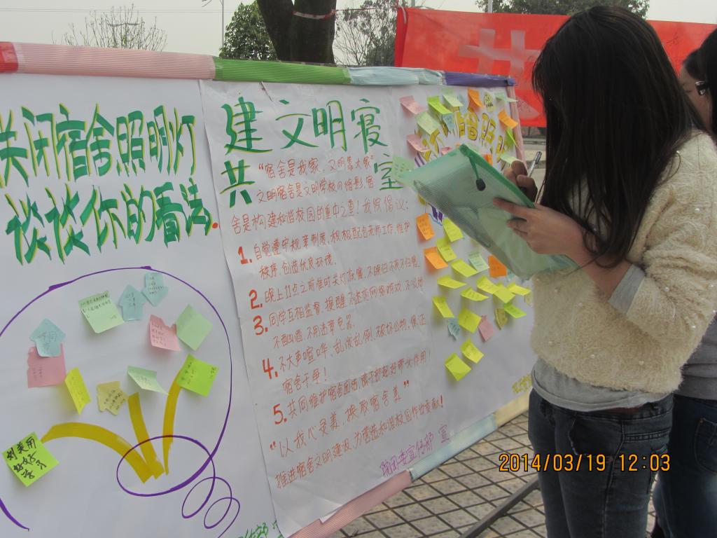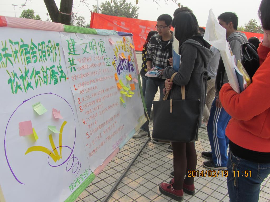 活动前夕,宿管会同学做了精心准备,制作了本次活动的宣传录音,绘制了海报,制作了宣传展板和签名横幅。希望通过宿管会学生干部的力量,让这次活动达到良好的宣传效果,深入人心。活动开始后,在宿管会积极的宣传下,在委婉动听的宣传录音的吸引下,过往同学对本次活动表现出了极大的热情,纷纷停步在共创文明寝室的签名横幅前,签下了自己的名字,做出了郑重的承诺,并在留言板上提出了自己关于晚上11点关闭寝室照明灯的看法。通过在留言板上的意见来看,大部分同学对晚上11点关闭寝室照明灯这项举措还是赞同的,表示可以保障睡眠、节约用电、避免因为是否关灯而产生寝室矛盾等等。
