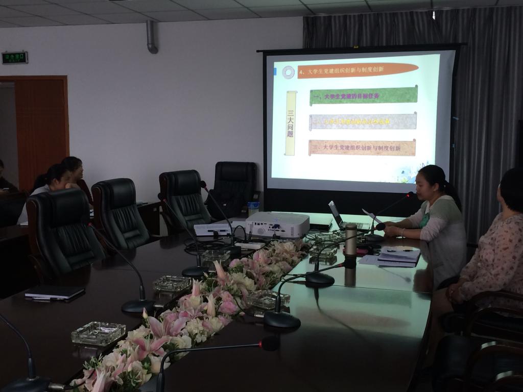 最后,来自工程管理系的李梅老师和大家分享了她参加西南交大辅导员培训中心培训后的心得体会,分别就中国梦战略思想与当代大学生理想信念教育、如何培养和实践社会主义核心价值观和大学生党建组织创新与制度创新等方面与在座的各位老师进行了交流。