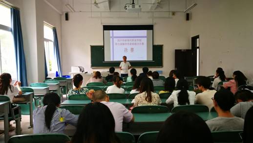 2019年7月4日下午14:00,由学生处主办的我院第七届辅导员职业能力大赛决赛在教学楼102教室成功举行。学院党委副书记解登高、学生处副处长汪军华和各二级学院分管学生工作的领导出席了本次比赛,来自两个校区各学院党委副书记和辅导员等近50人到场观摩了本次比赛。比赛由学生处处长汪军华主持。