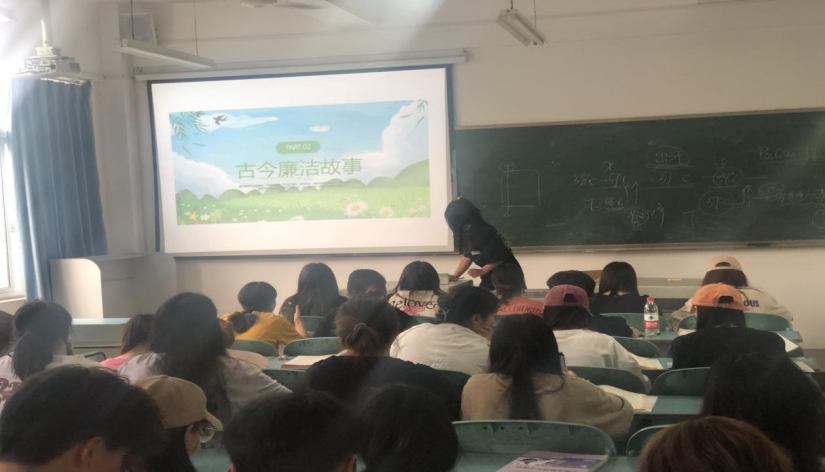 首先,辅导员向同学们讲述古今廉洁故事,列举了苏东坡、陆游、于谦、海瑞、周恩来等名人案例。