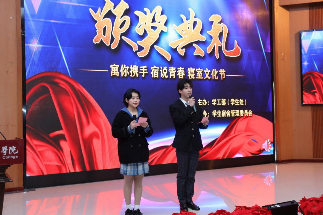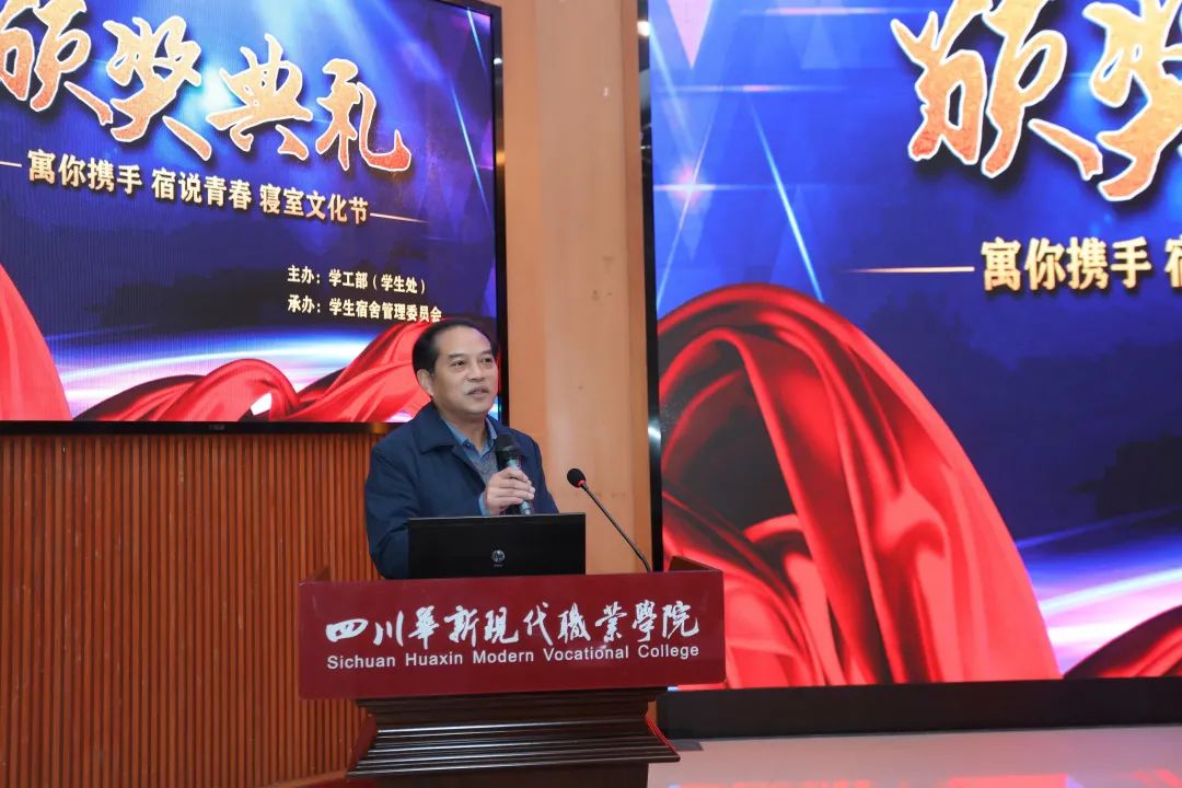 2021年12月17日中午,四川华新现代职业学院2021年度 “寓你携手 宿说青春”寝室文化节颁奖典礼在学术报告厅举行。学院党委副书记解登高、学工部(学生处)处长汪军华及各二级学院书记、副书记出席了颁奖典礼,学工部(学生处)全体老师、宿管中心老师代表、宿舍管理委员会全体干事及获奖寝室成员共计300余人参加了本次典礼。