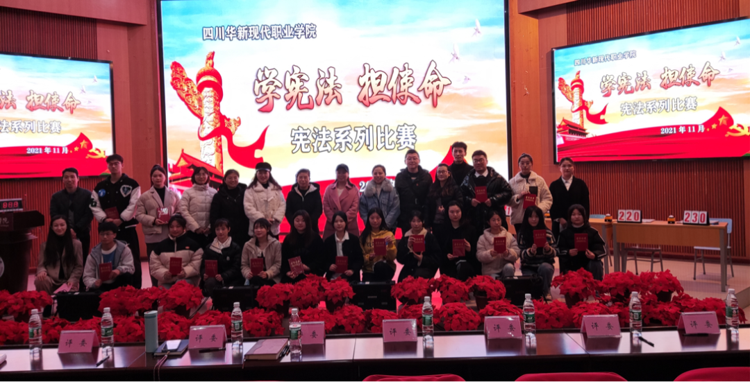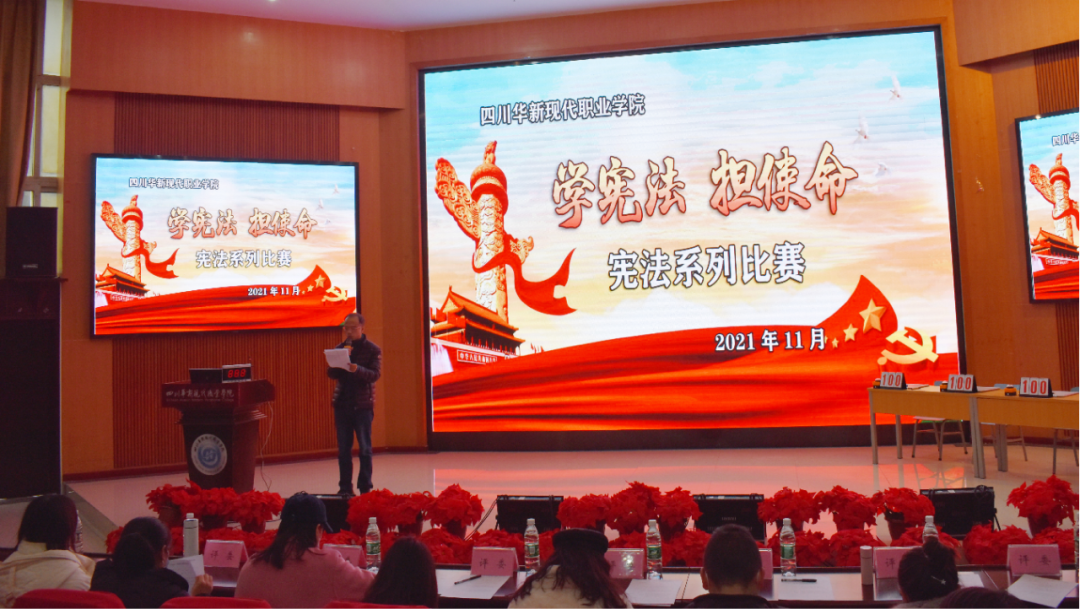 为深化贯彻学习党的十九大会议精神,深化依法治国详细实践,推动树立宪法法律至上的理念,根据《四川省教育厅关于举办第六届全省学生“学宪法 讲宪法”活动的通知》要求,学工部(学生处)于2021年11月29日中午13:30在学术报告厅参加举办“学宪法 担使命”演讲比赛和知识竞赛决赛,通过各二级学院初赛,18名选手进入了本次决赛。