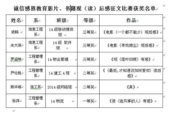 通过一系列的活动,在全院范围内形成一种诚信、感恩的校园氛围,对校园学风、校风建设起到了推动作用。