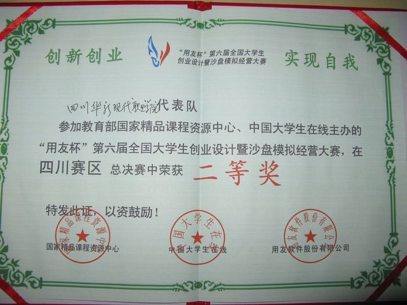 为了进一步深化高职教育的特色,坚持技能竞赛与教学改革相结合,加强学生的个人发展与团队协作精神,2010年6月11日至6月13日,我院经济管理系的学生组成创业设计参赛队,在专业老师的带领下,到西华大学参加“用友杯”第六届全国大学生创业设计暨沙盘模拟经营大赛四川赛区总决赛,经过两天的激烈角逐,获得四川赛区二等奖的优异成绩。