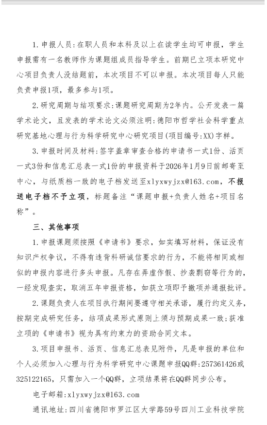 课题申报 德阳市哲学社会科学重点研究基地心理与行为科学研究中心2026年度项目申报通知