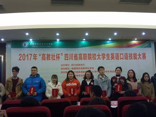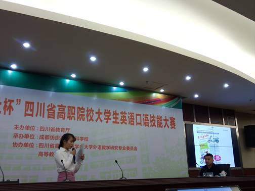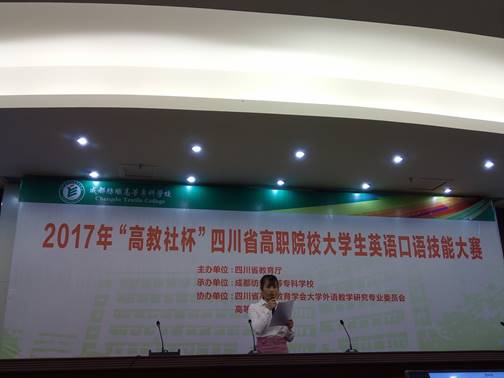2017年3月18日,2017年“高教社杯”四川省高职院校大学生英语口语技能大赛在成都纺织高等专科学校举行,来自全省50余所高职院校的选手参加了比赛。赛事分为专业组和非专业组进行比拼,分为“职场描述”(Presentation)和“情景交流”(Interview)两个环节,主要考察选手对英语语言的应用能力。来自各个高校的参赛学子们使尽浑身解数,纷纷展现出各自的实力,角逐省赛出线名额,代表四川省参加全国决赛。我院2016级电子商务2班的颜莉同学通过学院层层筛选,经过指导老师基础教育部张丽妍老师的培训,最终代表学院参加了四川赛区复赛。