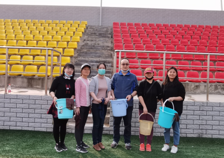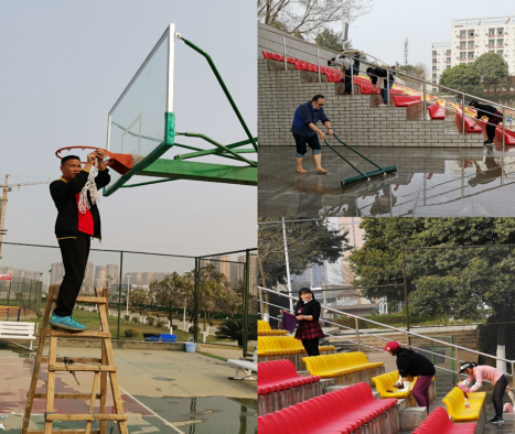 后勤处和保卫处工勤人员的合作努力,用高压消防水管反复冲洗篮球场和主席台、看台上沉积的泥灰。老师们则拿上自备的清洁工具,在张华主任带领下按照分工投入打扫工作。有的用推水器清洁篮球场和主席台地面,有的爬上梯子更换篮板球网,有的用抹布擦拭座椅和栏杆,有的用水桶搬运清水、清洗抹布,大家互相配合,全情投入,清洁工作有条不紊地进行。通过一个下午的集体努力,运动场卫生环境焕然一新,一排排整齐干净的座椅在阳光下熠熠生辉。
