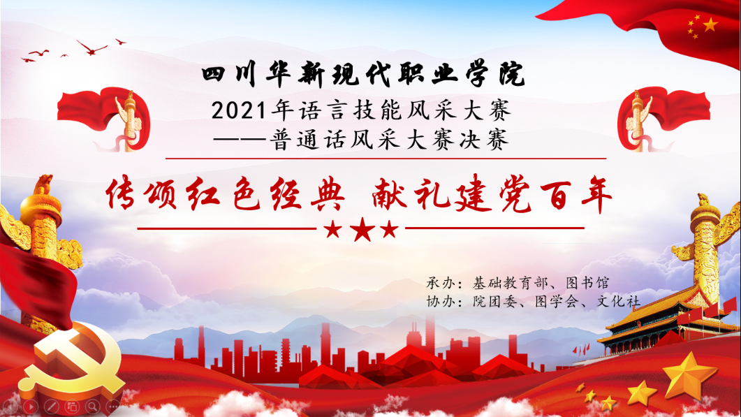 基础教育部积极携手图书馆于5月13日晚上18:00在学术报告厅隆重举办“2021年语言技能风采大赛——‘传颂红色经典、献礼建党百年’普通话风采大赛”决赛。出席的嘉宾有学院涂捷副院长、基础教育部张华主任、艺术学院冯晓云院长、经管学院彭娟书记等。担任本次大赛的评委有基础教育部副主任张丽妍老师、信工学院书记李凡老师、学工部王柯童老师、经管学院李敏南老师、工商学院李佳琪老师、院办公室郑椿凡老师、院团委郭思屿老师等。