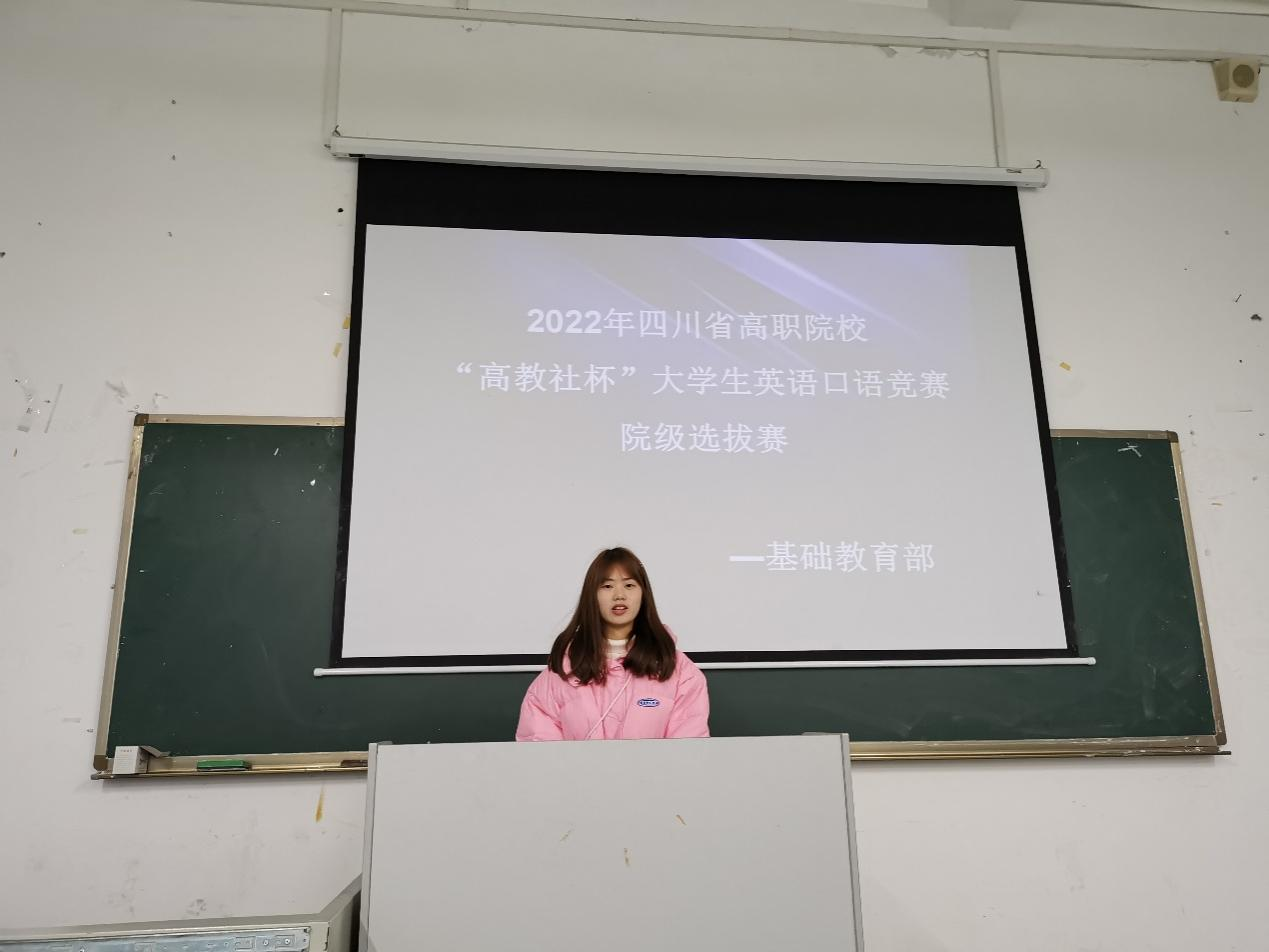 2022年四川省高职院校“高教社杯”大学生英语口语竞赛即将在下个学期举行,为了展现和提高我院学生英语口语表达能力,激发学生学习英语的积极性,也为了尽早为此项传统赛事做准备, 基础教育部于12月7日中午12点在博学楼102教室举行了院级选拔赛。参赛的10名选手是从各个二级学院报名参赛的46位学生中经视频初赛产生的。他们需要现场抽题,做十五分钟准备,并在三分钟内完成图表描述任务。 经过一番激烈角逐和评委审慎评分,最终有6名选手获得一、二、三等奖,基础教育部将安排专业指导老师对前3名选手进行下一轮培训,再从中遴选出1名学生代表学院参加明年春季四川省复赛。现将获奖名单公布如下: