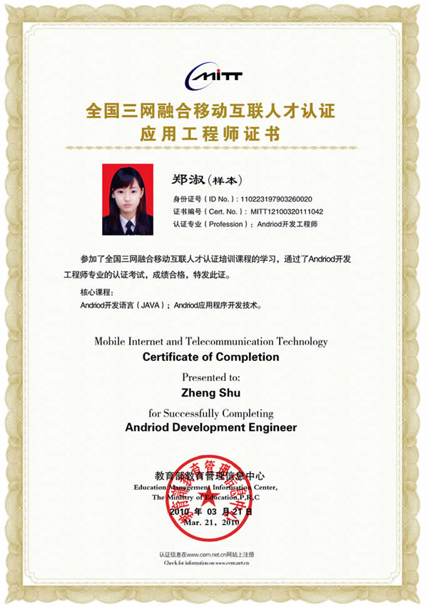 MITT项目是教育部教育管理信息中心立项推出的面向各大中专院校计算机科学技术、通信工程、电子信息工程及电子商务相关专业学生及社会专业人士在移动互联,电子商务和通信技术等相关领域的培训项目。通过认证考试,标志着该学员对于该领域的基础知识和专业技能的良好掌握,满足了企业相对应岗位的用人需求,可获得由教育部教育管理信息中心颁发的MITT教育工程职业技能证书。