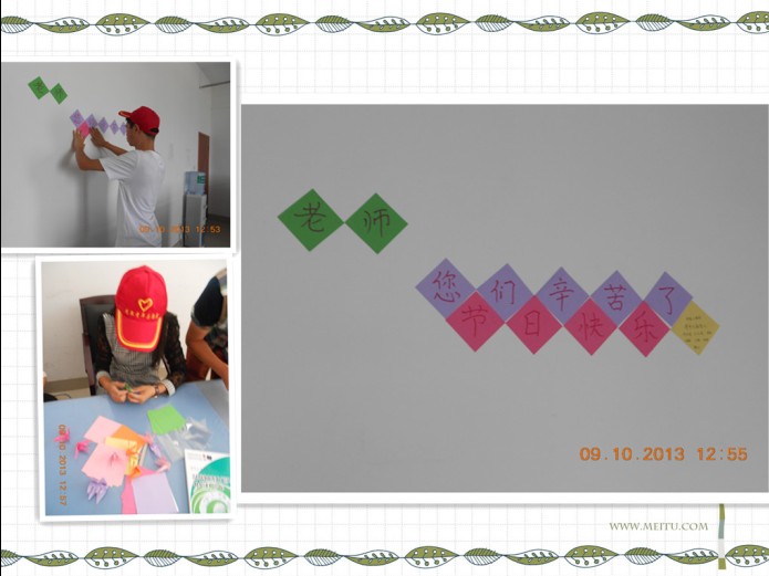 活动分为两个个部分,第一是打扫整理办公室并在办公室墙上制作墙饰,让老师拥有一个愉悦的环境;第二是写祝福语、折千纸鹤送给老师,希望通过这样的方式表达学生对老师的感谢之情。活动过程中每位志愿者都将自己心中那颗感恩之心融入到了所做的事情中。