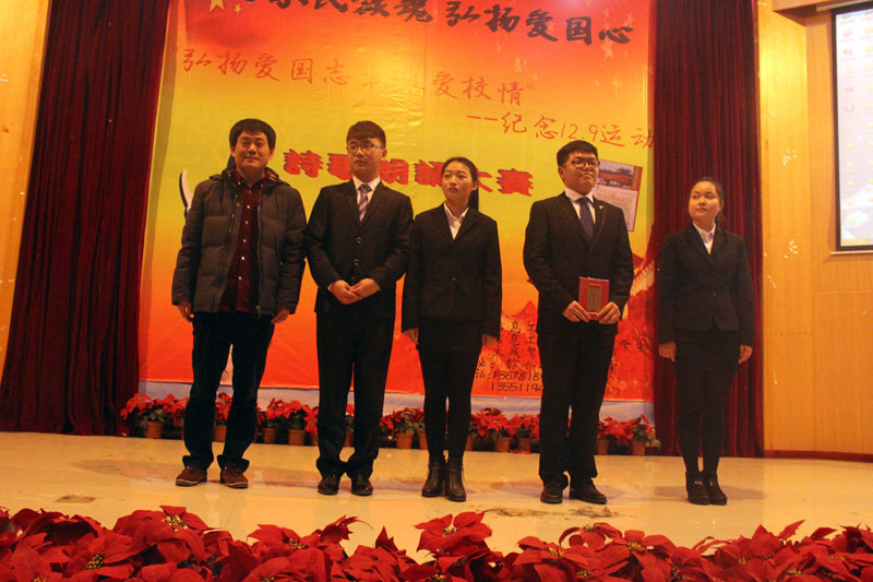 本次活动以王璇等3位同学朗诵的《雪花飘进1935》拉开大赛的序幕,参赛选手们的激情朗读,把爱国、爱校,铭记历史等内容表演的淋漓尽致。随着比赛的深入,在参赛选手的感染下,现场同学们的脑海里再次浮现出当时爱国学生高呼“保卫、北平、保卫华北”的情景。大赛之中还特别安排了“红歌接唱”,“12.9关历史问题抢答”等环节丰富比赛内容。其中赞助商林师傅的优美歌曲,把师生的激情引发起来。