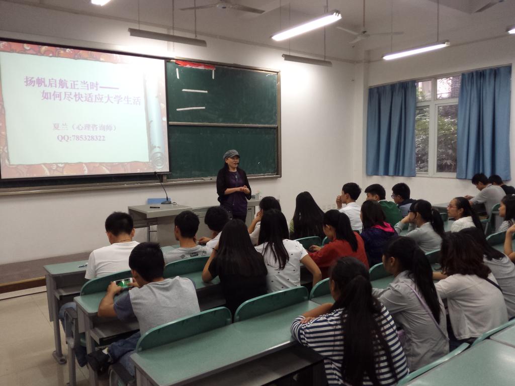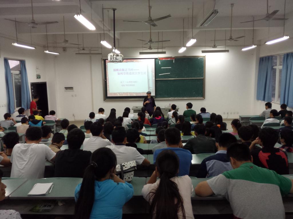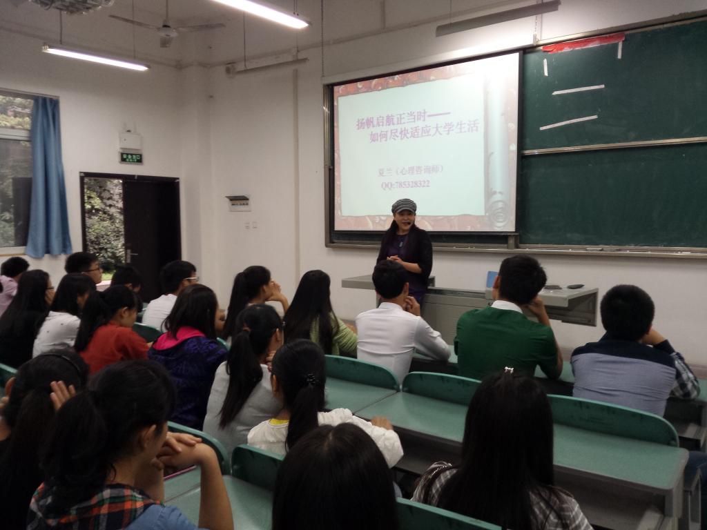 9月24日晚6:00—7:30,我系2014级全体同学在教学楼102教室参加了题为“扬帆起航正当时,如何尽快适应大学生活”的主题讲座。本次讲座特邀国家二级心理咨询师,我院旅游系主任夏兰教授主讲。夏教授具有多年心理咨询工作经验,由于长期从事高职教育工作,对高职学生心理状态,常见心理问题等都有深入研究。