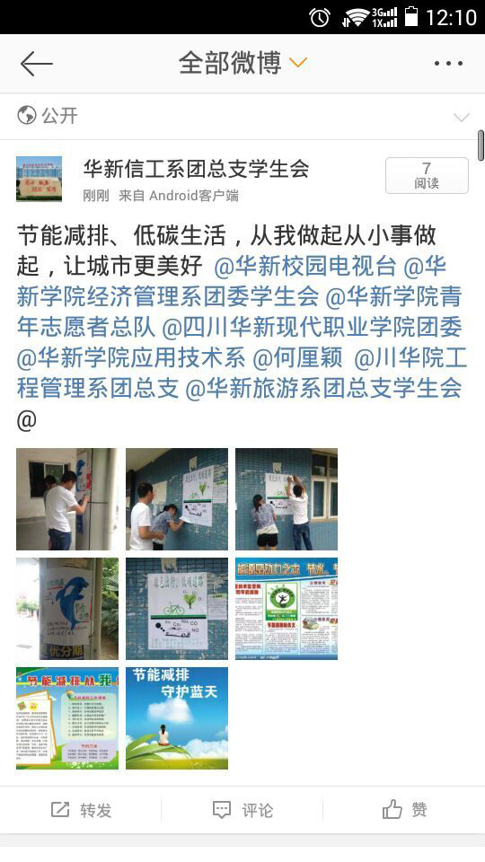 2015年6月13日至19日为节能有道、节俭有德宣传周以及低碳城市、宜居可持续低碳日宣传日,信工系6月15开展了生态文化和生态理念的宣传活动,具体行动包括在学院张贴海报、发微博等活动等,活动倡导节能减排从自身做起,从小事做起,让我们的地球充满绿色。
