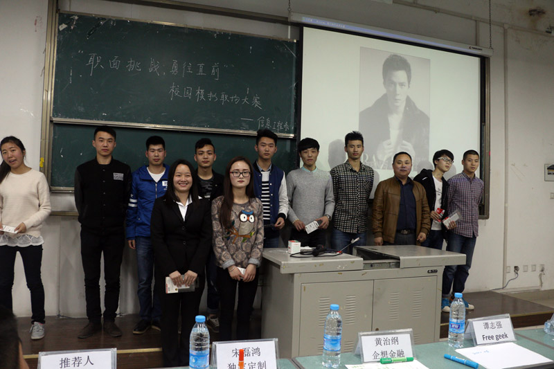 大赛开始后,求职者们纷纷登场。他们热情洋溢,充分展现了同学们健康阳光的精神风貌;他们声情并茂,言语中彰显了自己的自信和才华,面对“公司各位老板”的提问,他们思维敏捷,淡定而全面的回答不仅赢得了老板的认可,也博得了在场观众的热烈掌声。赛后,张老师针对同学们的表现进行了点评,他的点评和总结让在座的各位同学受益匪浅。经过激烈角逐,14级多媒体班张胜峰同学获得“最佳人气奖”,14级金融班蒋文钦获得“最佳表现奖。”