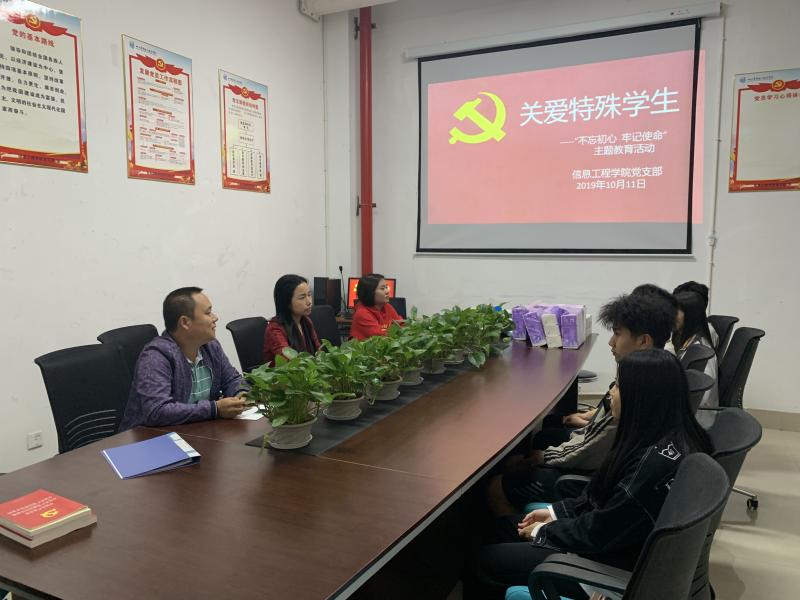 2019年10月11日四川华新现代职业学院信息工程学院党支部在明德楼111会议室开展了关爱特殊学生座谈会,座谈会由学院党支部副书记张启才同志主持,李凡书记、辅导员霍冰影、刘丹老师以及信息工程学院2019级残疾学生参加。