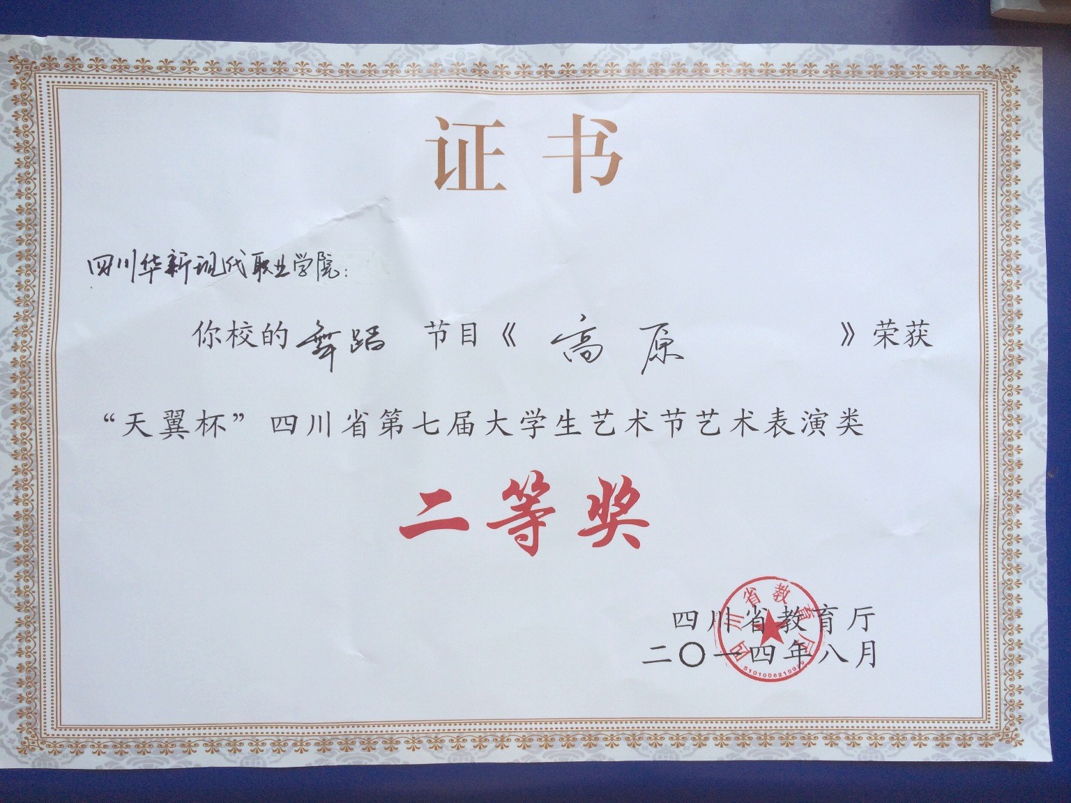 四川省大学生艺术节每三年举办一届,由省教育厅主办。本届大学生艺术节以“我的中国梦”为主题,共收到报送的表演类节目247个。我院大学生艺术团舞蹈队近四个月精心排练,最终在激烈的竞争中从全省各高校选送的247个节目中脱颖而出,夺得了二等奖。