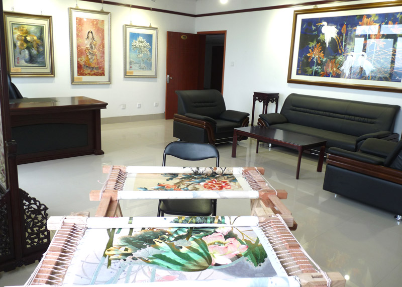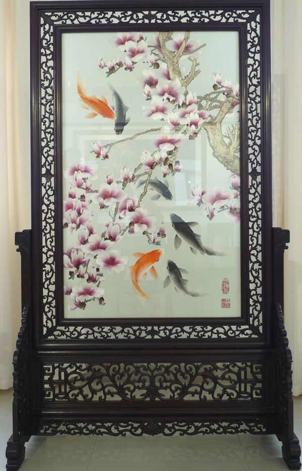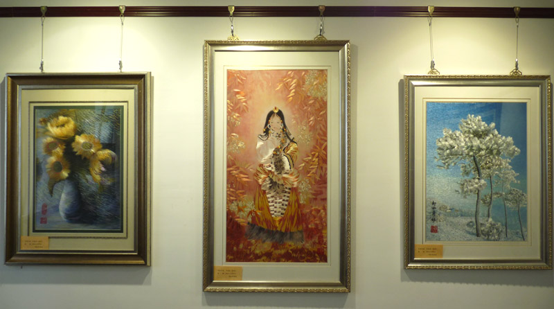 从事蜀绣艺术生涯四十余年,所绣作品绣针洒脱灵活、线条自如、整体感强,具有独特的艺术风格。“郝淑萍大师工作室”里陈列着郝淑萍大师的多幅作品:单面绣《荷塘》系采用著名国画大师黄永玉写意作品,在修法上大胆出新,色彩明快,是一副绝佳的刺绣精品;双面座屏《玉兰鲤鱼》构图清雅,寓意深刻,是不可多得的双面绣佳作;单面乱针绣《葵花》以飘逸的针法表现出葵花与花瓶的构成,耐人寻味;单面绣《喜悦》多针法刻画藏族丰收的景象,姑娘淳朴,发自内心的喜悦,表现得淋漓尽致;单面绣《芙蓉鲤鱼》锦鲤沿波出,芙蓉傍水开,展现了传统针法的深厚功力……其余作品都出自于“郝淑萍大师工作室”艺人们的妙手巧绣。