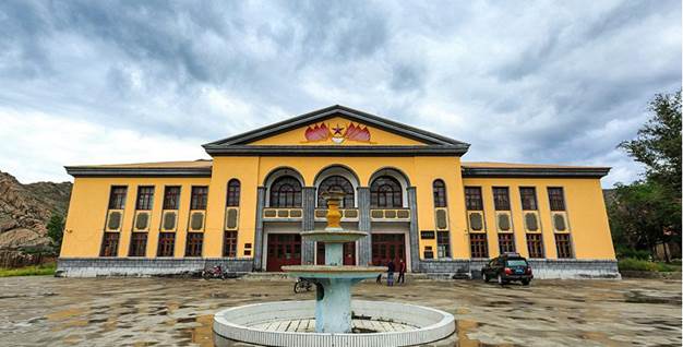 可可托海地质陈列馆原为可可托海矿区职工俱乐部,始建于上世纪五十年代,是全疆目前保存最完整的俄氏风格建筑。站在广场上直视,只见厚重云层下一幢黄色楼宇矗立着,三角屋檐上一颗五角星熠熠生辉,年代感呼之即出。