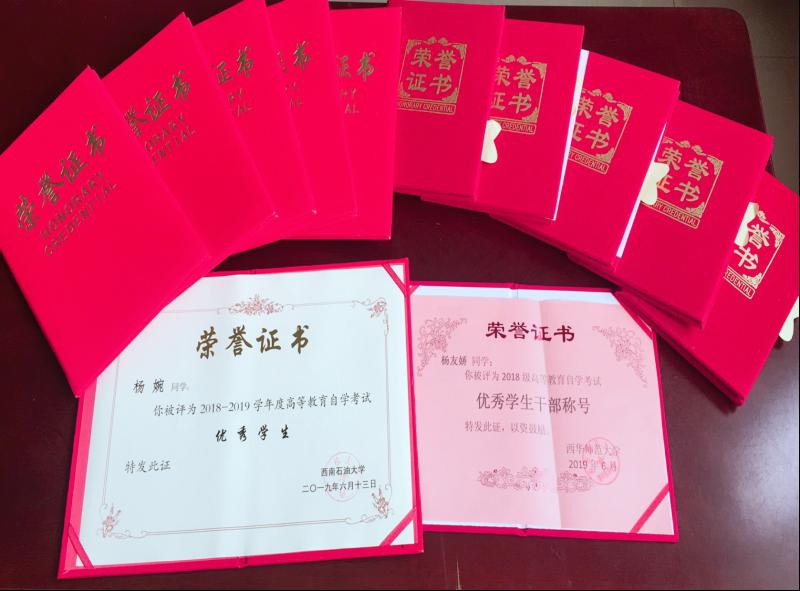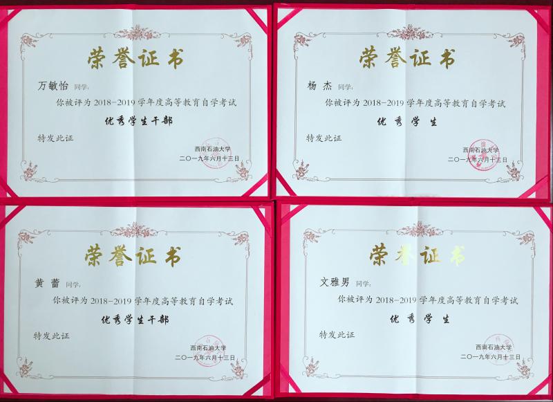 今年6月,根据主考院校西南石油大学和西华师范大学关于评选2018-2019年度优秀毕业生、优秀学生、优秀学生干部的通知安排,我院何婉玉、万杨强等50名同学由于在本科就读期间表现优异,最终顺利通过评选。