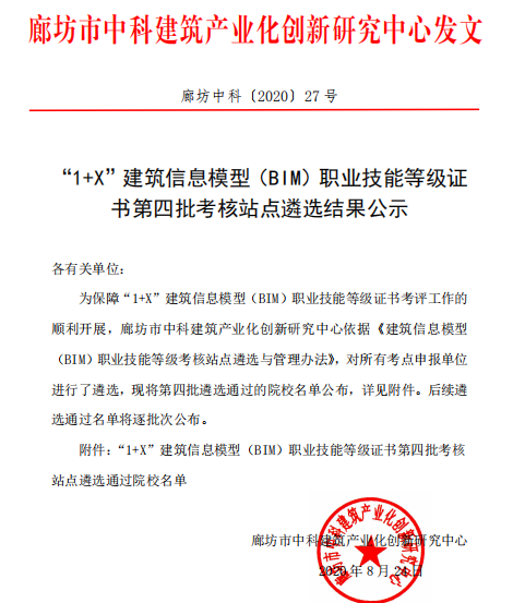 近日,1+X建筑信息模型(BIM)职业技能等级证书第四批考核站点遴选结果公布。经廊坊市中科建筑产业化研究中心前期对试点院校进行考点遴选后,同意我院设立为1+X建筑信息模型(BIM)职业技能等级证书考核站点。