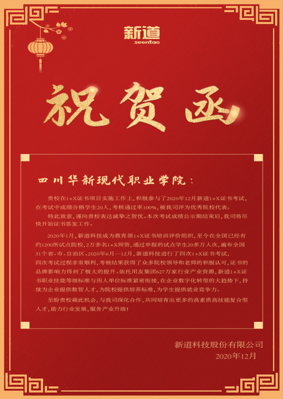 12月28日,学院“ 1+X ”业财一体信息化应用职业技能等级证书考试再次传来喜讯,该考试由培训评价组织新道科技股份有限公司负责组织,培训部协同经济管理学院具体实施,来自学院经济管理学院相关专业 20名考生全部通过考试,考试过关率高达100%,远超全国平均水平,被新道科技股份有限公司评为优秀院校代表。