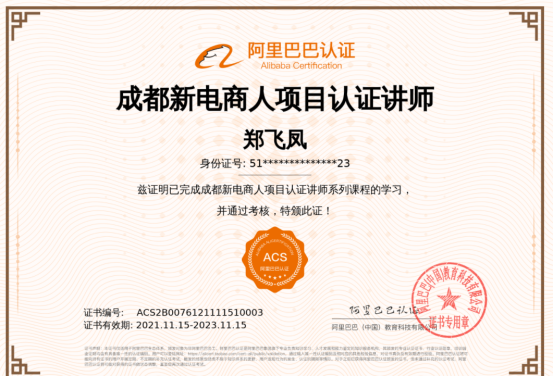 近日,从成都市人社局传来消息,我院郑飞凤、赁潇潇、高建英等三位电子商务专业教师获得阿里巴巴(中国)教育科技有限公司认证的“成都新电商人”项目认证讲师。
