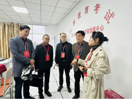 考试期间,四川省纪委监委驻人力资源社会保障厅纪检监察组组长、四川省人力资源和社会保障厅党组成员潘瑶芳一行莅临学院考点检查指导考试工作,学院副院长周勇、对外合作处与培训部负责人陪同视察了考务办公室、标准化考场、考场指挥中心等场所。省厅领导对学院的考试组织、考场环境布置等工作给予了充分肯定和高度好评。