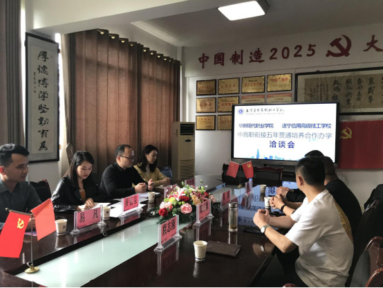 3月30日下午,华新学院对外合作处处长符又仁一行四人赴遂宁应用高级技工学校(以下简称遂宁应高学校)举办中高职衔接五年贯通培养合作办学洽谈会,遂宁应高学校党委书记、招生副校长吴锡春、教学副校长周洪、德育副校长郑立新、招生处长袁志刚、教务处长何汶君等领导参加了此次洽谈会。