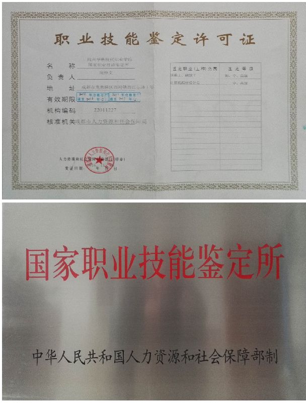 近日,成都市人力资源和社会保障局发文批准我院成立国家职业技能鉴定所(成人社函[2016]2-34号文),机构编码为22011227。12月19日,我院在成都市职业技能鉴定指导中心正式领取职业技能鉴定许可证和资质铜牌。