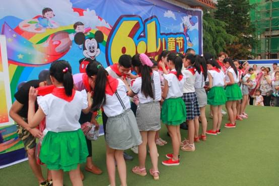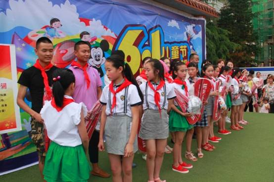 少先队代表为我院代表佩戴上鲜艳的红领巾,接过送给他们的足球、羽毛球拍等礼物。