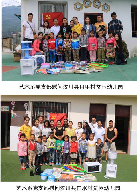 为推进“学党章党规、学系列讲话、做合格党员”学习教育活动的深入开展,引领老师党员和学生党员以实际行动践行“两学一做”。6月7日-8日,华新艺术系党支部组织党员走访慰问四川省汶川县雁门乡白水村和月里村的幼儿园乡村教师和小朋友们。
