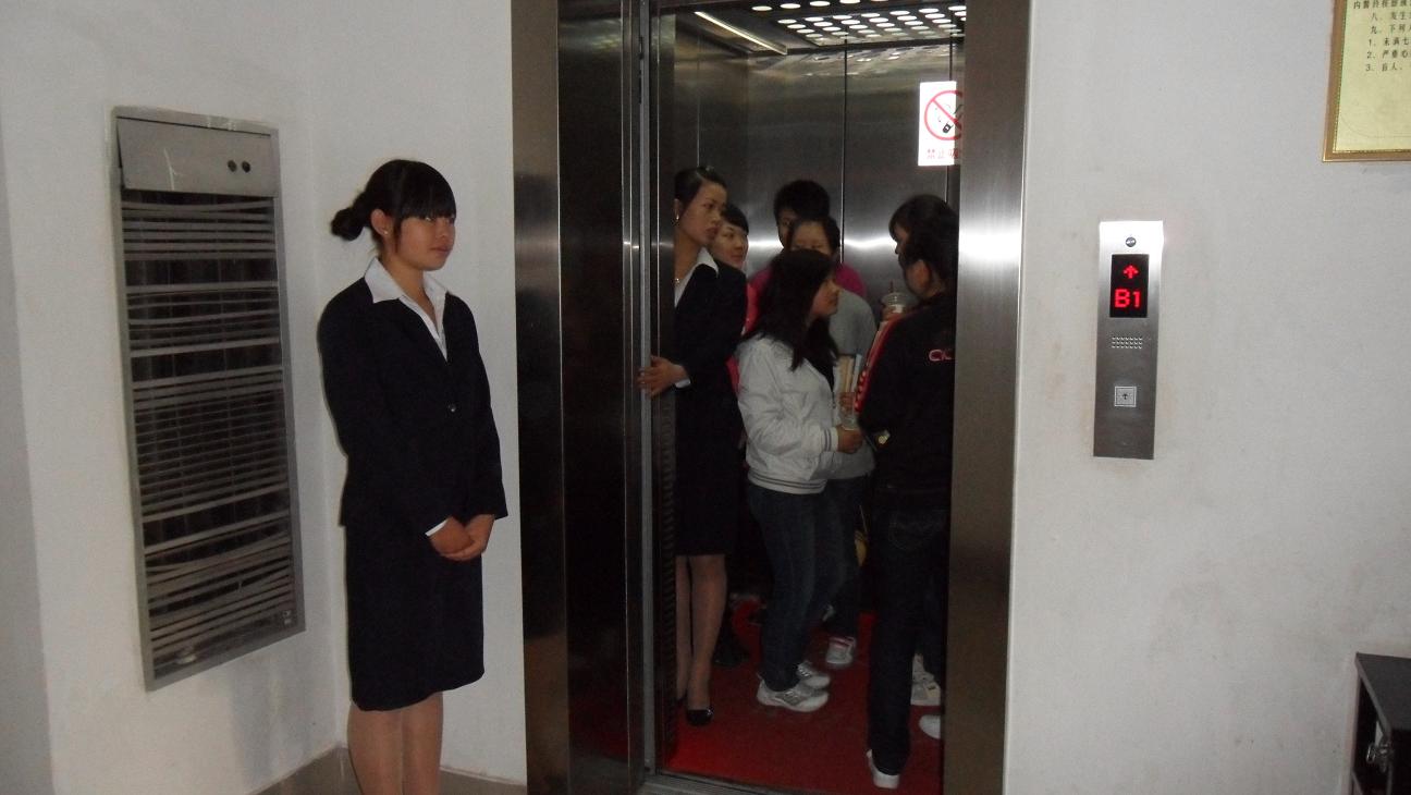 这是旅游系10级酒店管理专业学生为全校师生提供的电梯礼仪服务。作为《酒店前厅服务与管理》课程的实训内容之一,学生在课堂上学习了电梯服务礼仪,与学院现有的设施相结合从而进行实景操作,真正做到了学以致用,同时也能够怀着一颗感恩的心为学院师生服务。