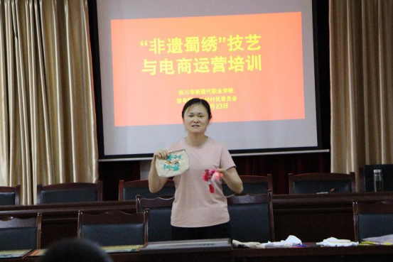 2023年5月23日上午,在成都市青白江区弥牟镇白马村党群服务中心,四川华新现代职业学院文创旅游学院的蜀绣设计与工艺专业师生一行到校企合作成立的白马村电商孵化园负责培训白马村村民在家灵活就业从事蜀绣生产。