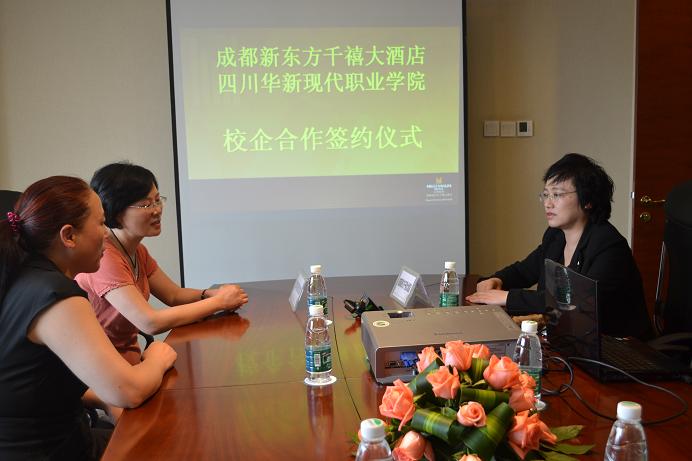 在签约仪式上,康院长首先对陈总及新东方千禧酒店表示感谢,并指出学院将结合校企合作发展思路及企业发展需求不断探索、完善合作机制并做好学生培养工作。随后陈总监介绍了千禧酒店的情况,并表示酒店会为我院学生提供校外实习实训的平台,同时为酒店储备人力资源。最后双方代表举行了签字仪式。