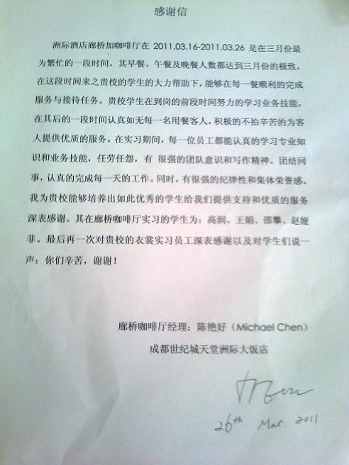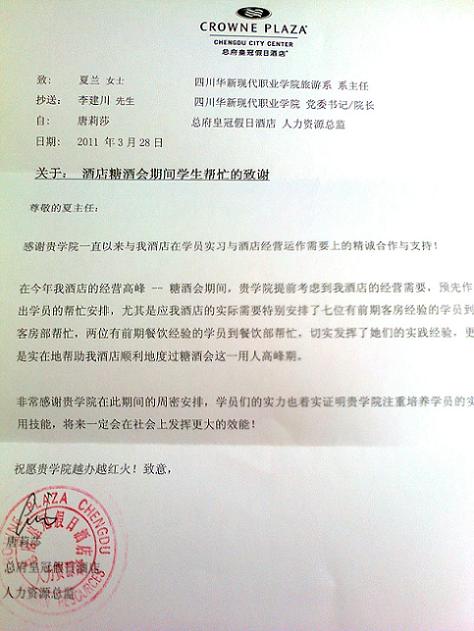 2011年3月14日至26日,我院旅游系09级学生分别在洲际酒店集团、皇冠总府假日酒店进行为期两周的社会实践活动,为酒店承办的大型会展活动提供优质服务,他们出色的表现赢得了酒店的高度评价,近日洲际酒店集团和总府皇冠假日酒店为我院旅游系发出了感谢信,同时也对学院培养应用型人才的教育理念给予高度评价。