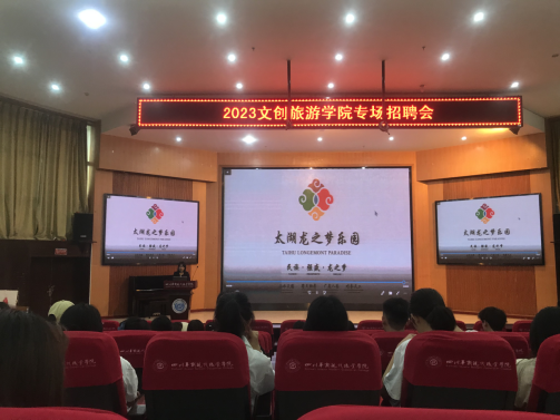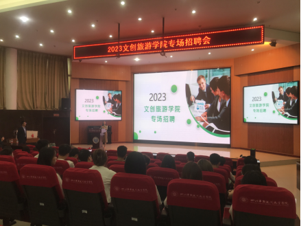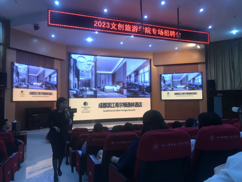 2023.5.26上午,文创旅游学院在学术报告厅举行旅游酒店类专业专场招聘会,邀请了三家知名酒店来我院进行宣讲招聘,它们分别是成都滨江希尔顿逸林酒店、成都龙之梦大酒店和成都盛美利亚酒店。