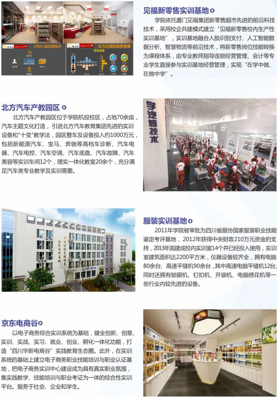 其中电子商务专业为四川省重点专业,与京东集团合作开展订单培养;物流管理专业为四川省特色专业,与京东集团、顺丰物流开展订单培养;商务数据分析与应用专业,聘请阿里巴巴数据学院讲师授课;网络营销、移动商务、互联网金融与慧科集团共建,就读共建专业入学即签订就业协议,100%推荐就业。
