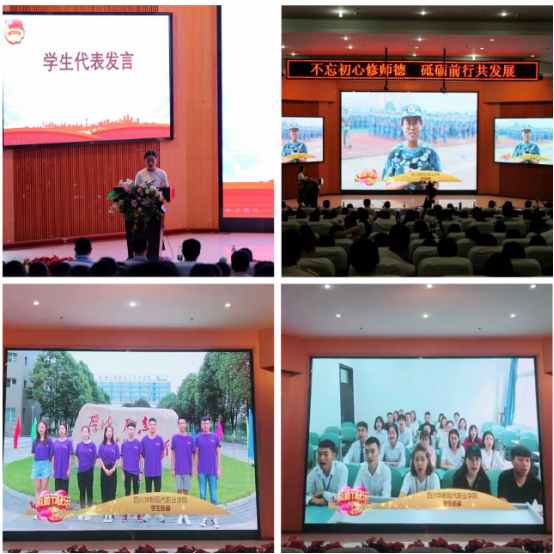 学生代表通过发言,结合自身的经历,向大家讲述了刚进入大学这个陌生的环境时,非常迷茫,感到不自信时,是老师帮助自己找到了方向,鼓励自己树立信心,同时带来了温暖。院团委青年志愿者为教师准备了教师节祝福微视频,展示了同学们最想对老师说的话以及为教师制作手工礼花的过程,表达了对辛勤耕耘的老师们的诚挚的谢意和祝福。