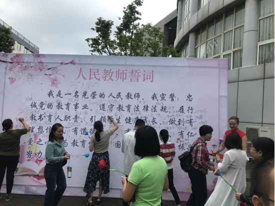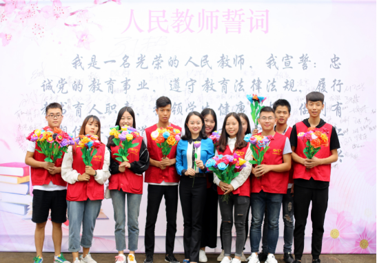 会议开始前,院领导和老师们在宣誓墙上郑重写下自己的名字,表达了自己牢记誓词、践行诺言的坚定决心;院团委组织青年志愿者和协会学生向与会教师赠送手工礼花,传递学生对教师的节日问候和温馨祝福。