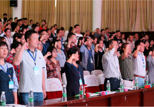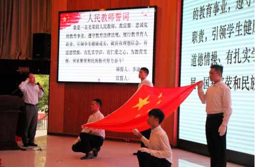 大会在庄严的国歌声中拉开帷幕。全体教师在学院党委书记李建川带领下宣誓:“忠诚党的教育事业,遵守教育法律法规,履行教书育人职责,引领学生健康成长……”在神圣的国旗下,在学生的见证下,在严肃、庄重的宣誓中,教师们对自己所从事的事业进行了庄严承诺。